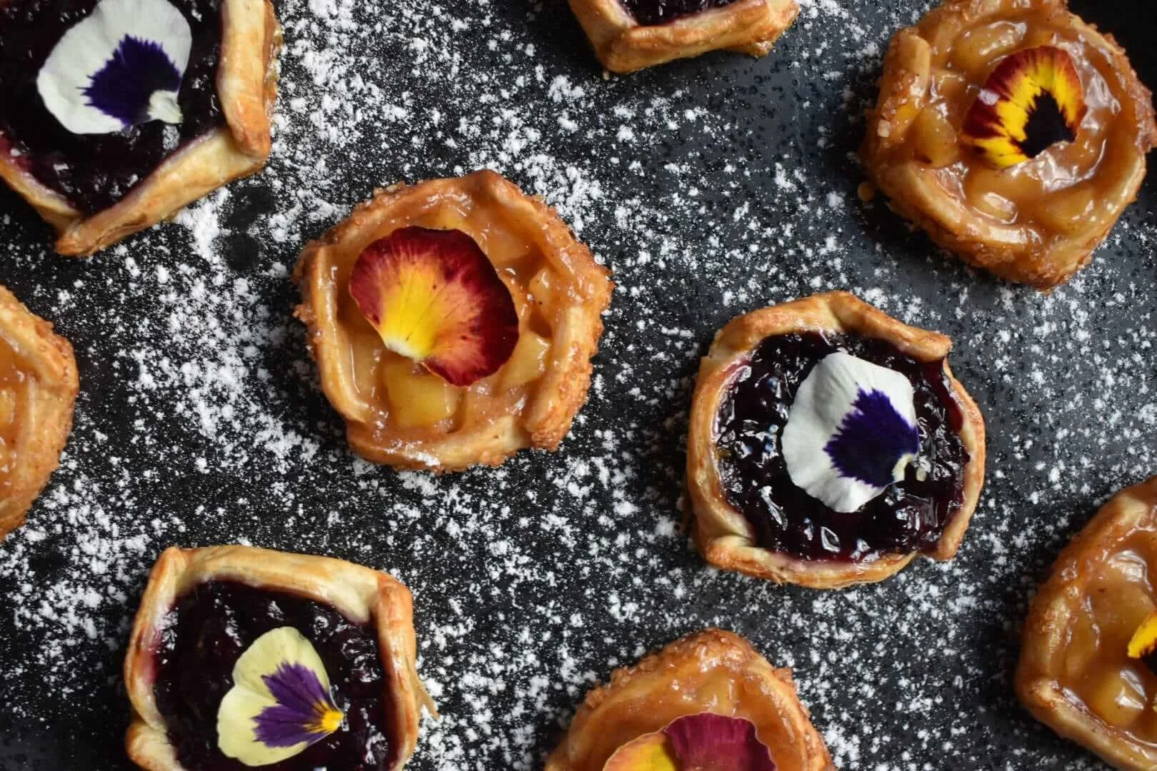 Elegant black plate with five pink-colored appetizers topped with herbs, edible flowers, and small garnishes, arranged around the center with scattered flower petals.